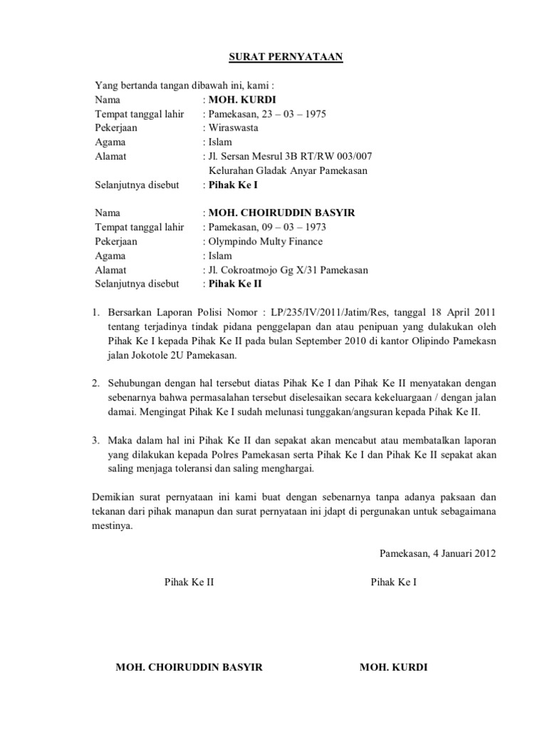 Doc Surat Pernyataan Damai Isnaini Puhi Academia Edu from 0.academia-photos.com Itulah contoh surat pernyataan kesanggunpan yang bisa kamu jadikan acuan untuk membuat pernyataan yang semisal. Biasanya surat ini dapat digunakan untuk mendaftar sekolah, terkena hukuman dari sekolah pada contoh surat pernyataan yang kedua ialah surat pernyataan perjanjian membayar hutang. Atau mungkin memerlukan suatu rekomendasi terlampir dari pihak tertentu juga perlu surat pernyataan. Untuk membuat surat pernyataan sebenarnya sahabat bisa browsing di internet hanya dengan mencari pada search engine maka akan muncul berbagai macam tutorial ataupun contoh. Contoh surat kronologis kejadian penipuan. Seorang karyawan ingin membuat surat pernyataan, namun dia bingung bagaimana cara membuatnya. Contoh surat pernyataan diri bersedia mentaati peraturan download kumpulan gambar. Surat pernyataan adalah surat yang dibuat untuk menyatakan bahwa seseorang telah atau tidak pernah ada beberapa jenis surat pernyataan yang biasanya digunakan untuk berbagai keperluan.